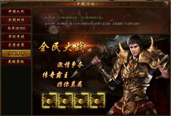 开服第四天晚上20:00~21:00系统自动开启攻城战,夺得沙城霸主,即可获得系统为您准备的精彩大礼一份。同时第一次夺得沙城的帮会将会获得2W元宝的奖励;奖励直接下发至帮主邮件内