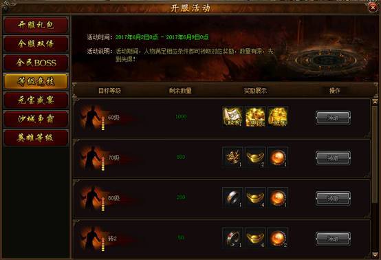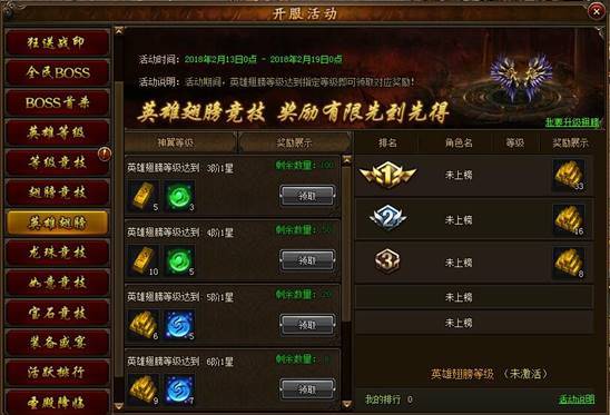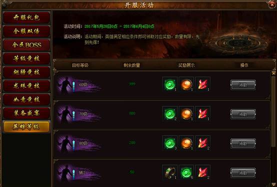 活动期间,英雄达到活动指定等级或转生等级,即可在活动页面领取相应的等级奖励,数量有限先到先得