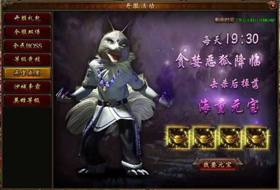 开服前三天每天19:30开启元宝盛宴活动;等级达到75级的玩家可进入仙踪岛击杀贪婪恶狐;击杀后可掉落大量不绑定元宝;