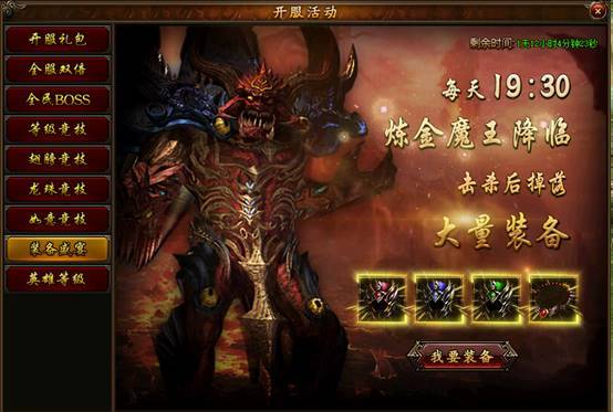 开服第四天到第七天每天19:30开启装备盛宴活动;等级达到75级的玩家可进入仙踪岛击杀炼金魔王;击杀后必定掉落高级转生装备;