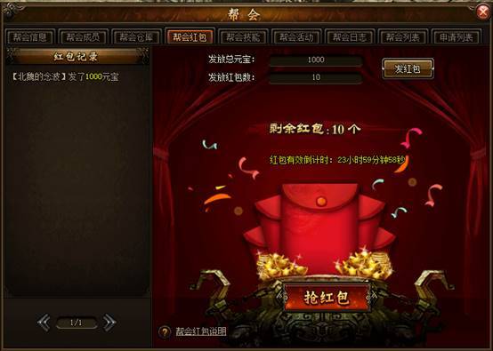 你可以在帮会红包里通过发放元宝的方式发奖励,以提高帮会的凝聚力和游戏激情。