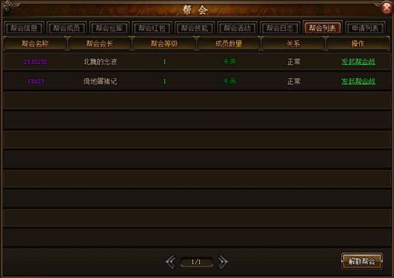 帮会列表中记录着游戏内所有的帮会情况,并且还可以对敌对的帮会发起帮会战,击杀敌对帮会的玩家不会增加红名;