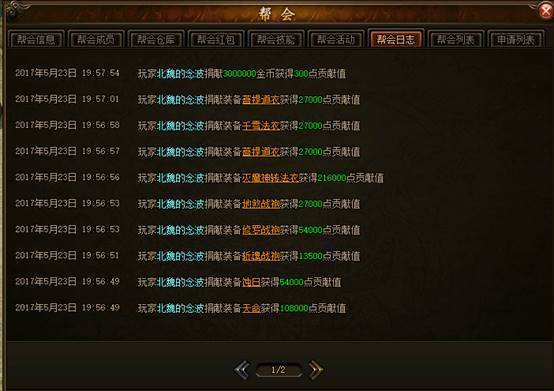 帮会日志中记录着帮会成员的一些操作行为,装备的捐献、兑换;金币的捐赠情况等;