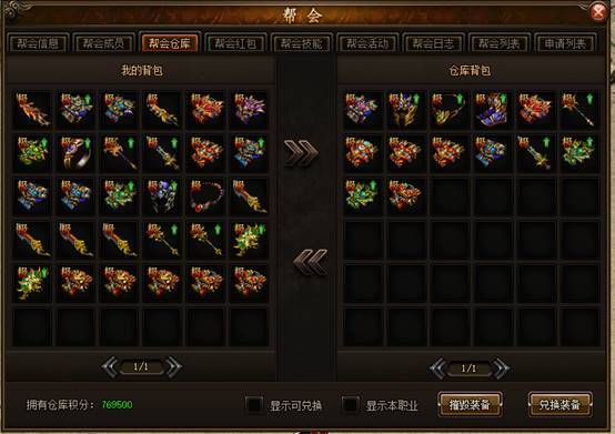 不用的装备除了回收,还可以放在帮会仓库内去兑换自己需要的装备也是一件很快活的事