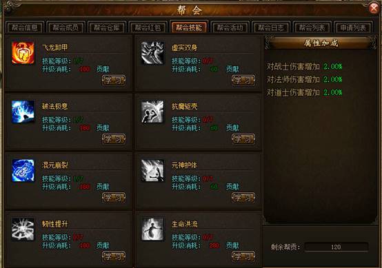 可以通过消耗帮会贡献来学习专属的帮会技能;