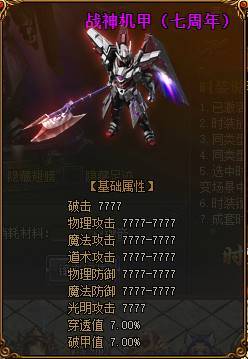 时装属性:破击 7777 攻击力7777 防御力7777 穿透值7% 破甲值7%