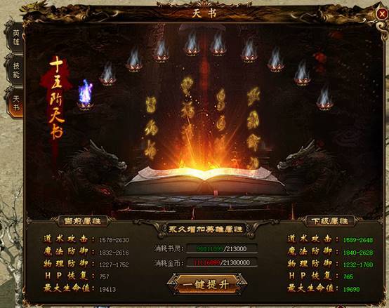 培养天书系统,可提高英雄技能等级且增加英雄自身属性,一次培养双重收益!